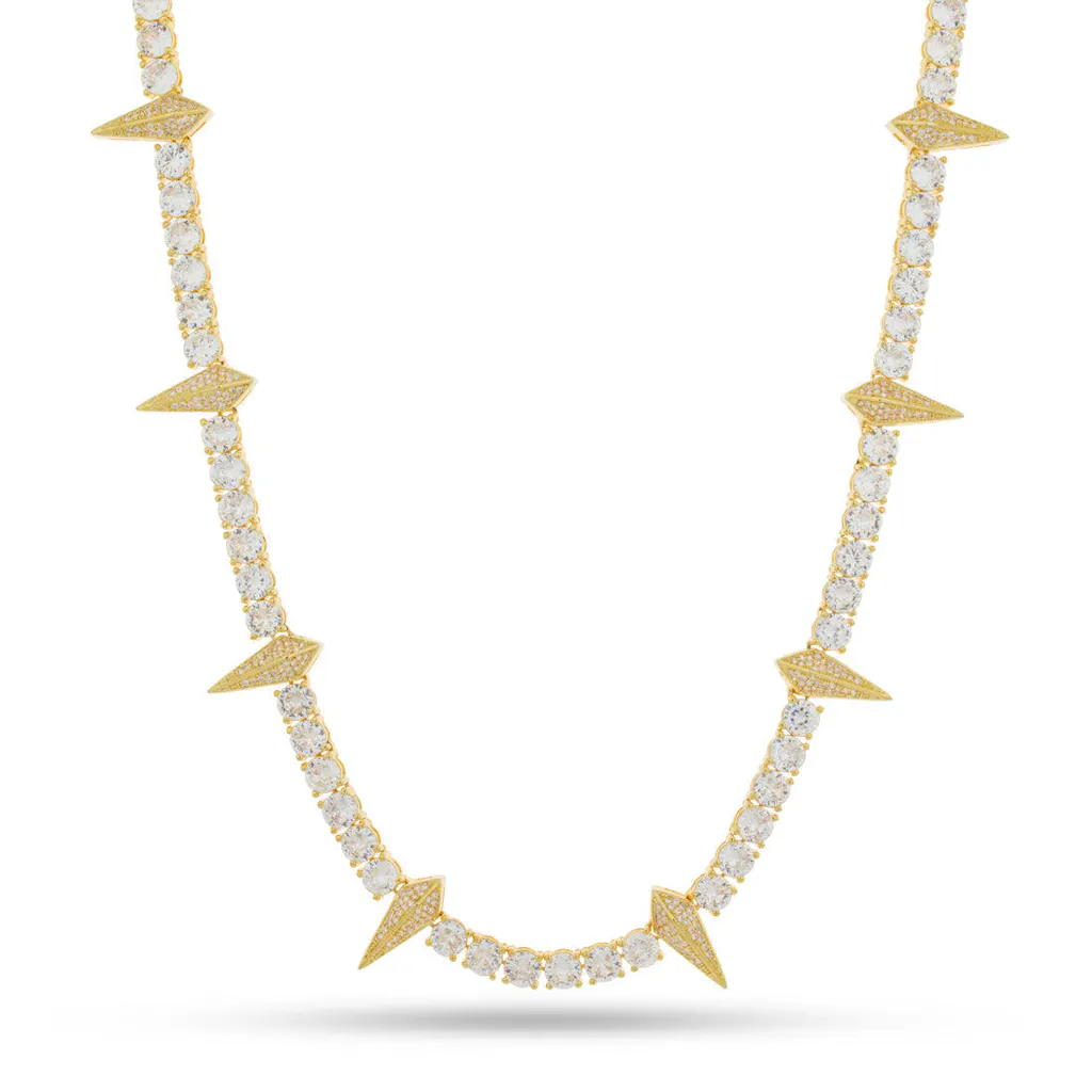 Inspired by a popular superhero, this new Wakanda-inspired Tennis Chain has spikes all around the chain. Each faceted spike is separated by a segment of tennis links and covered in as many handset stones as possible for the highest quality and shine.