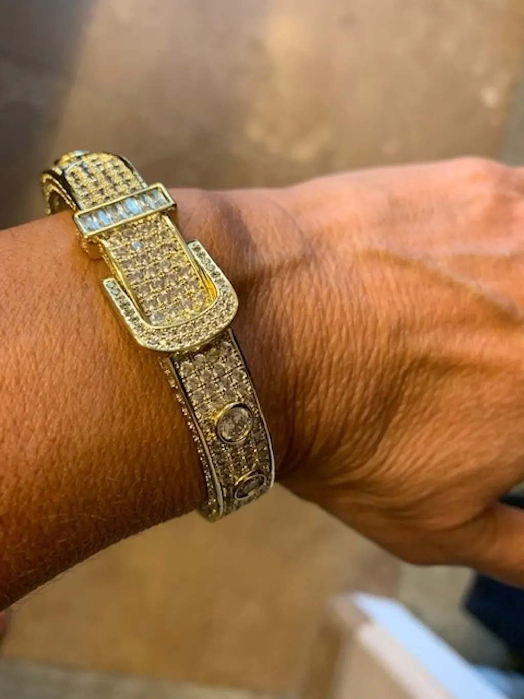 This gorgeous Buckle Bangle takes inspiration from high fashion buckle fastened jewelry. This piece has tons of stones on the top, sides, buckle fastener, as well as the Baguette stone-lined strap holder. Fine details extend to the greek key pattern on the inside of the bracelet.