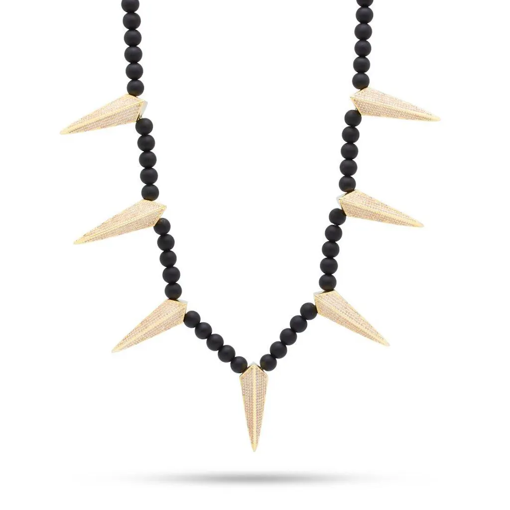 With semi precious, matte-finished Onyx gemstones, the Wakanda inspired necklace mixes street and contemporary that brings versatility to any ensemble. Iced with VVS Diamond Simulate stones and available in 14K gold plating or white gold plating stainless steel.